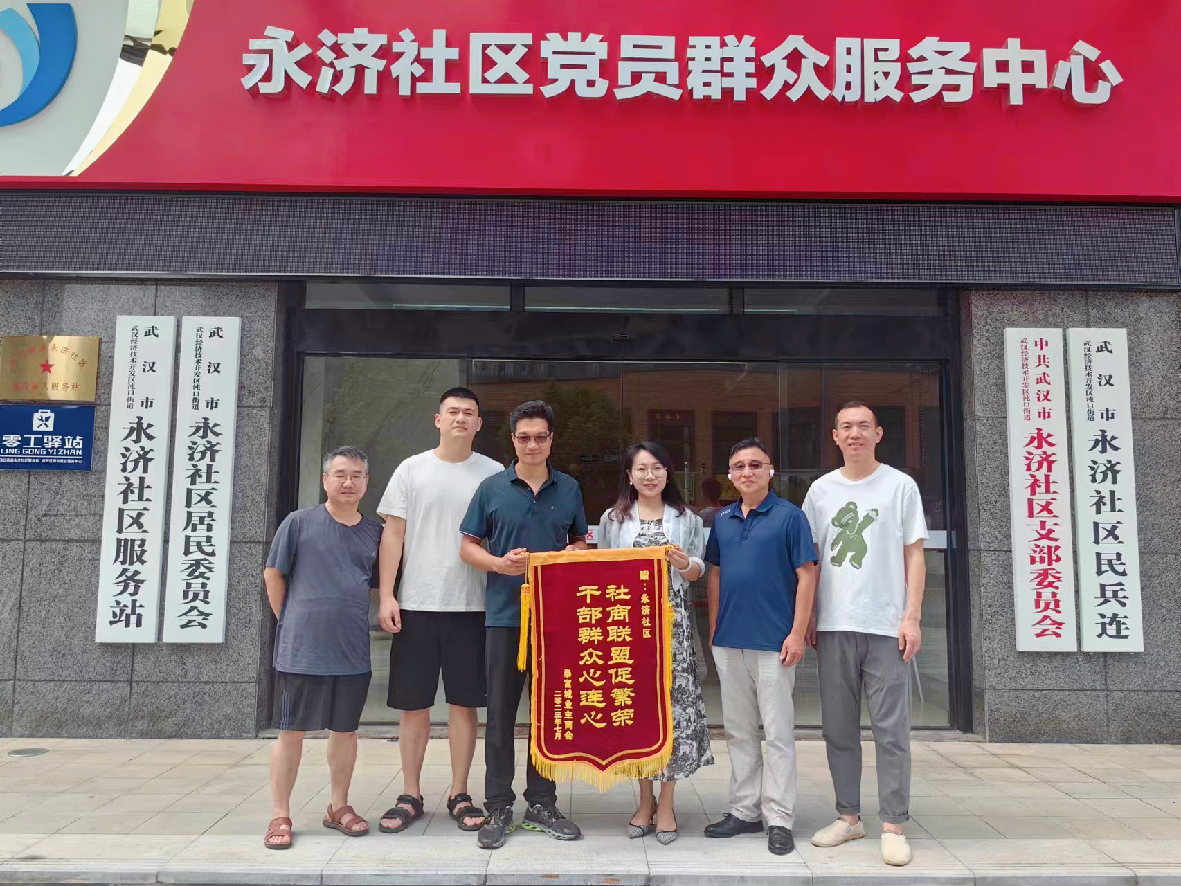 7月23日,湖北省武汉市经开区沌口街道永济社区泰富城商会会长李建将印有“社商联盟促繁荣,干部群众心连心”的锦旗送到永济社区党支部书记手中,以此表达对社区的感谢。