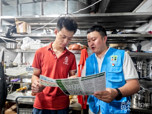 “厨房内的垃圾桶不正规,必须要加盖子。而且,垃圾处理完后,垃圾桶都要消毒、清洗,厨房的工作不能疏忽。”在南京建邺区南湖路一家餐饮店,垃圾分类志愿者徐翔与另两名志愿者一起,对餐饮店厨房的垃圾分类情况进行检查和指导。