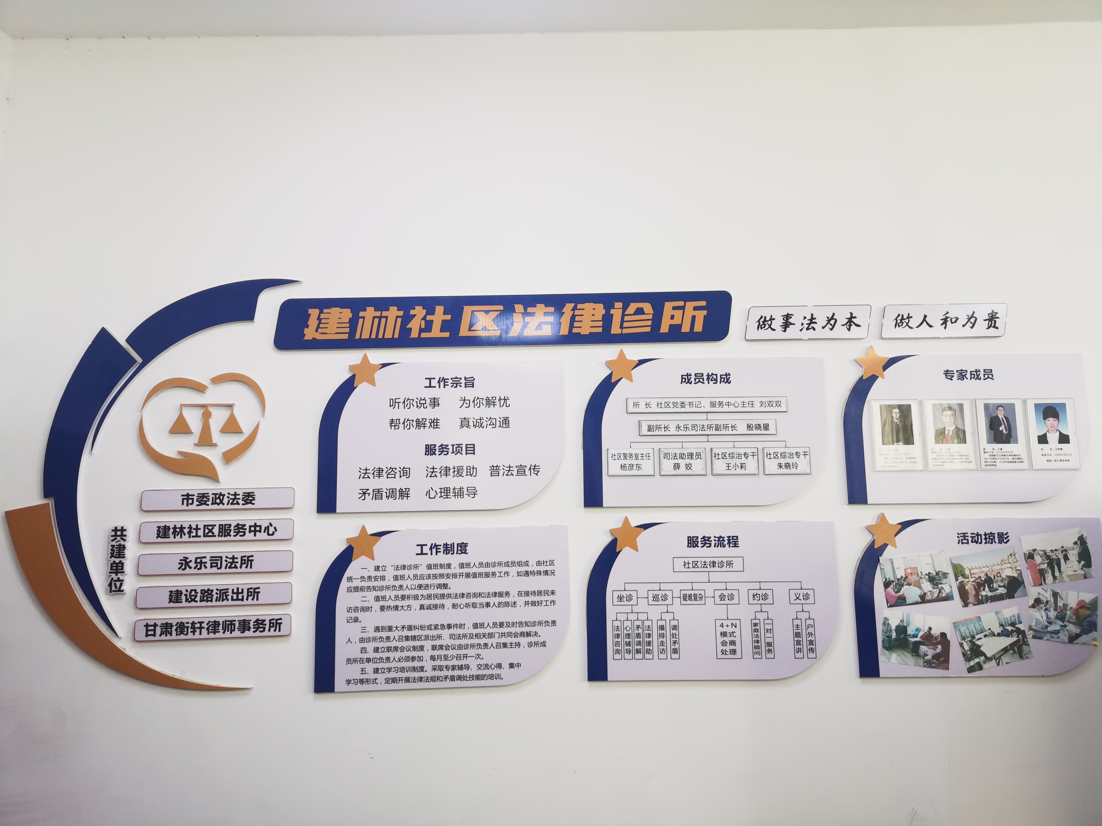 蓝色法治护航 守护和谐平安家园 社区推行“党建+普法服务”工作模式,与7家共建单位合纵连横,借鉴医疗诊所模式,开展公共法律服务,打造了社区“法律诊所”。积极发挥“三官一律一所”成员及心理咨询师“专家团”的作用,坚持“坐诊”、“巡诊”、“会诊”、“约诊”、“义诊”“五诊”工作模式,调解工作坚持以预防为主,调防结合,依法调解,做到小纠纷不出网格,大纠纷不出社区,及时化解社区居民纠纷。