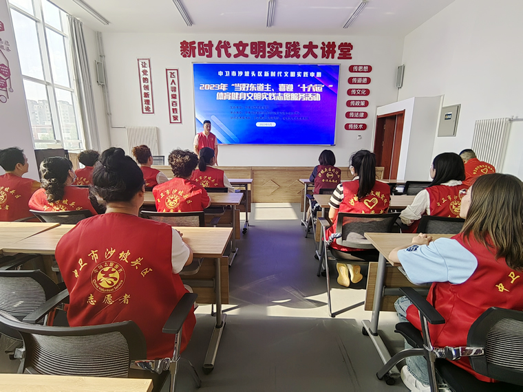 2023年5月29日下午,沙坡头区新利体育在线官网首页入口中心开展“当好东道主、喜迎‘十六运’”体育健身文明实践志愿服务活动。