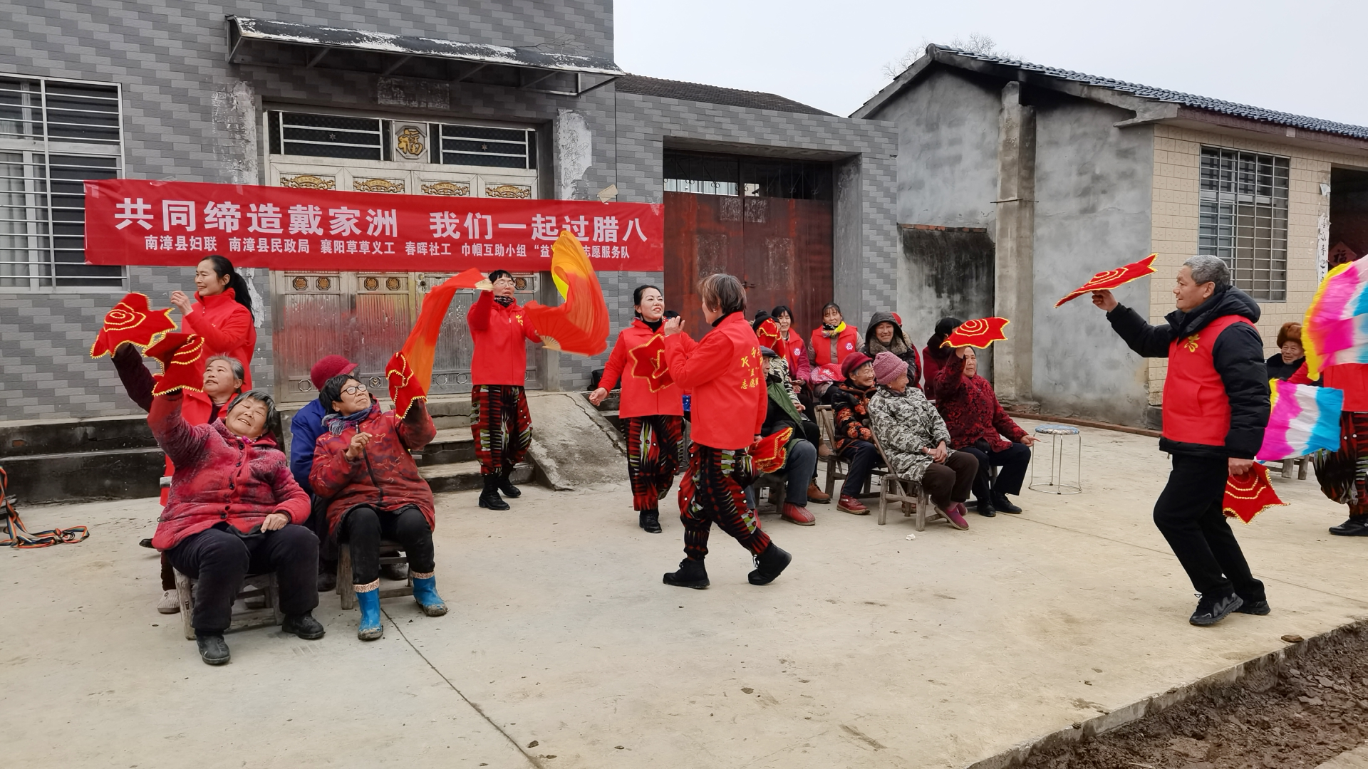 欢快的秧歌、优美的舞姿,动听的音乐,欢乐的笑容,1月17日下午,湖北省襄阳市南漳县九集镇八泉村戴家洲湾组热闹非凡,喜乐融融。襄阳市草草义工协会联合南漳县妇联、南漳县民政局、南漳县春晖社会工作服务中心、八泉村戴家洲巾帼互助小组、“益”起来志愿服务队在戴家洲开展腊八粥活动。