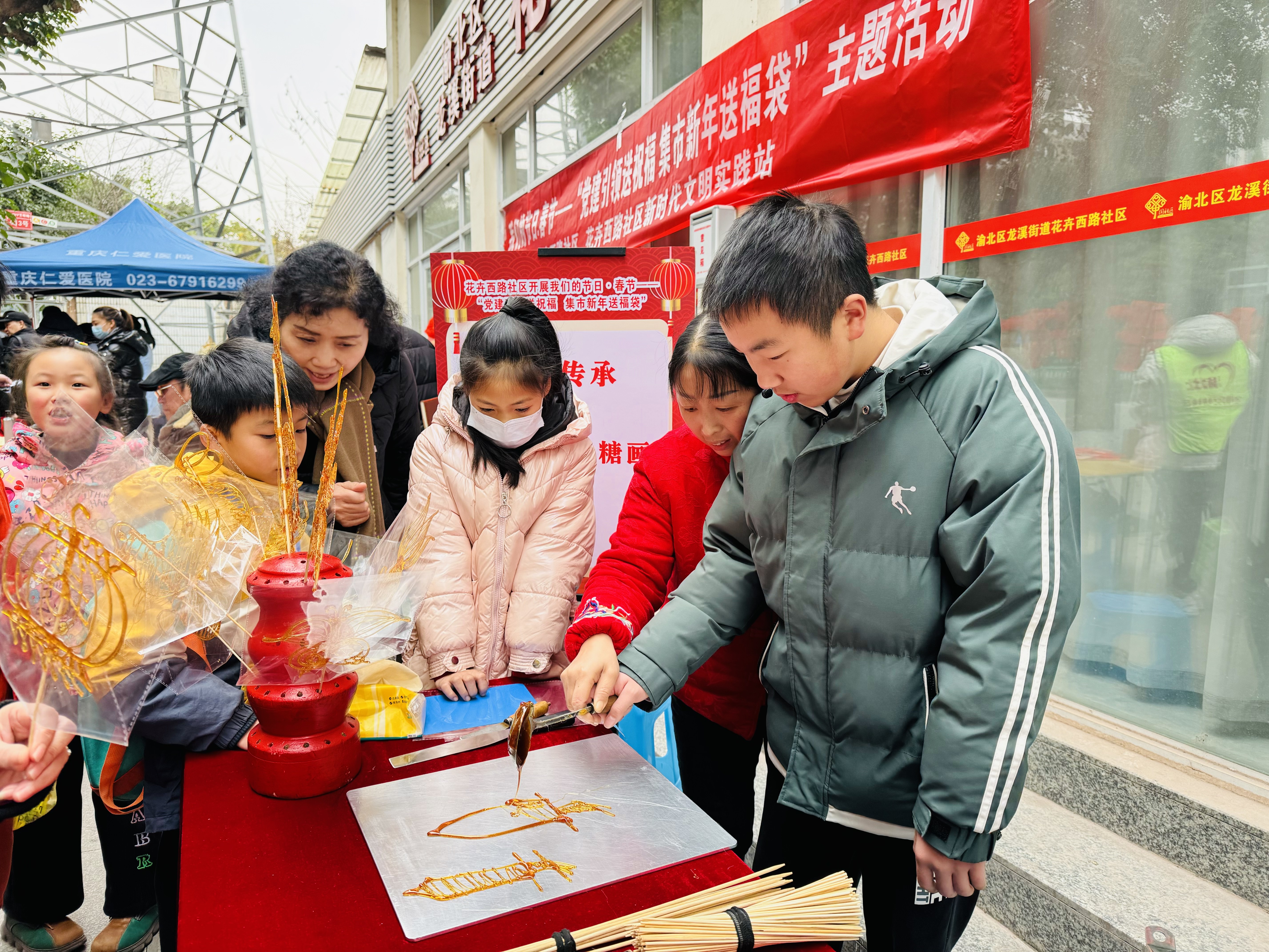 集市活动现场,年味布景打卡、手写春联迎福气、非遗文化糖画、盲盒福箱、中医送福袋多个摊位同时开展。不少居民都兴致勃勃地参与各个摊位的活动,打卡各个站点,体验“赶集”的乐趣,感受热闹的集市氛围。书法老师也将新春的祝福化作手写的一副副对联、一张张“福”字,寓意着新的一年好运常在、平安喜乐,往来的居民们纷纷领取了自己心仪的春联。“我要画一个龙”“我要画一个灯笼”要说最受欢迎奖的还得是非遗糖画体验摊位,大朋友和小朋友们都排起了长龙,等待亲自体验手绘糖画的乐趣,纷纷动手尝试,感受传统民俗文化魅力。同时另一边盲盒沾福气摊位给每位抽奖的居民都准备了不同种类的小奖品。