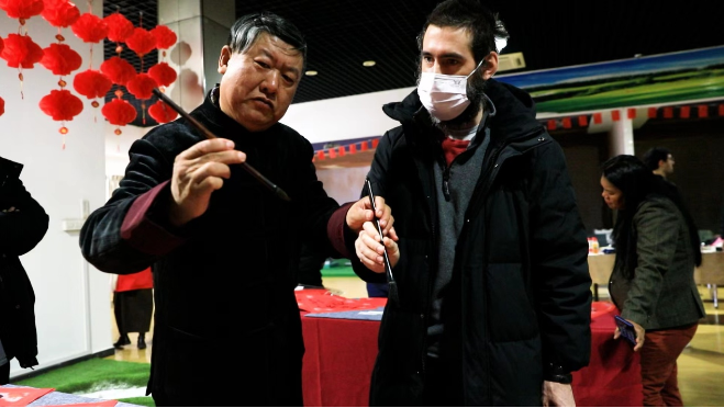 中外居民在长城家园社区学习书写毛笔字,迎新春(李沭星 摄)
