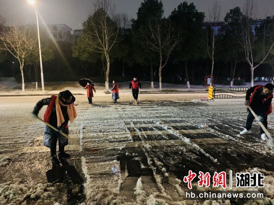 中新网湖北新闻2月23日电 2月21日晚,湖北省咸宁市气温骤降,暴雪来袭。风雪中,咸宁市咸安温泉街道路面上却是热闹非凡,身穿红马甲的志愿者们正在忙碌着。