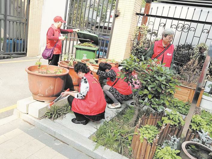 队员整理小区的小花坛