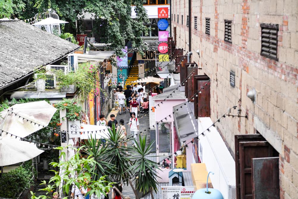 7月15日,游客在重庆市江北区五里店街道莺花巷合作村青年国际社区游览。新华社记者王全超 摄
