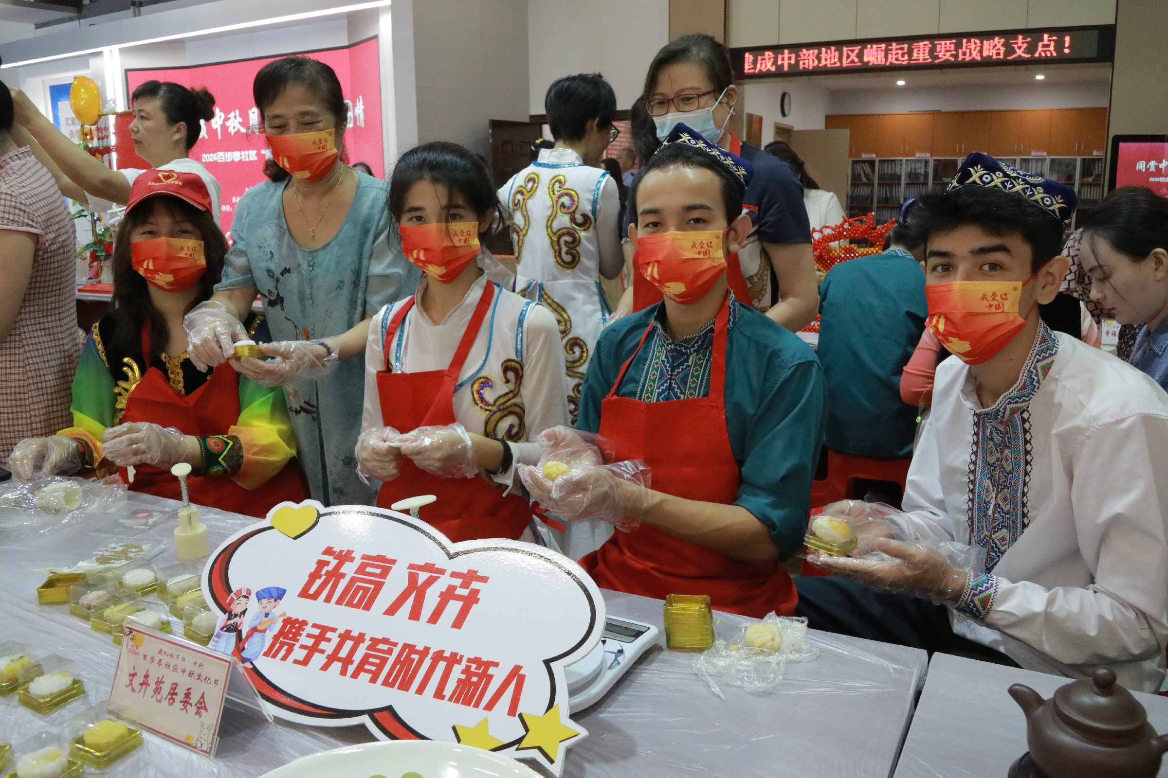 9月14日,湖北省武汉市江岸区百步亭社区通过民俗手工、文艺表演、讲志愿服务故事等方式,与全国文明家庭和最美家庭代表、少数民族代表、侨胞代表和居民代表等齐聚一堂,看演出、品月饼、话邻里,其乐融融。