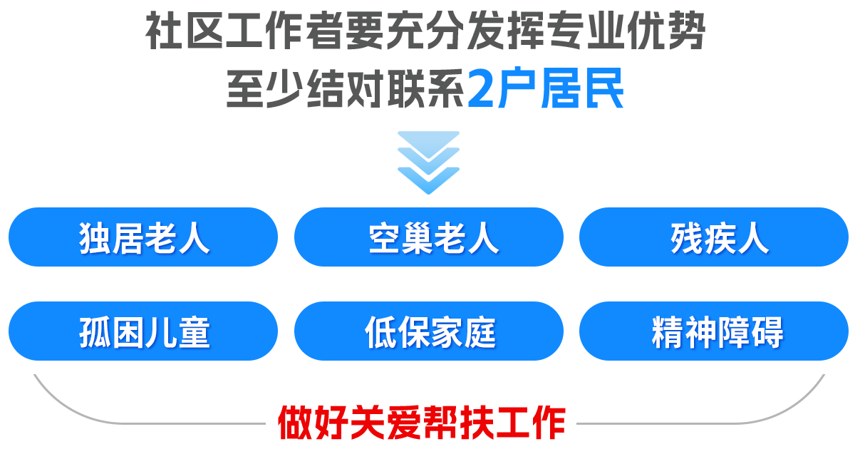 结成一组联系帮扶对子。社区工作者要充分发挥专业优势,至少结对联系2户居民,重点围绕独居老人、空巢老人、残疾人、无人抚养儿童、精神障碍、低保家庭等特殊困难群体,做好关爱帮扶工作。采取“社工+义工”双工融合模式,运用个案辅导、小组工作、社区活动等工作方法提供专业服务,力所能及地帮助他们解决生活难题,助力社区治理。