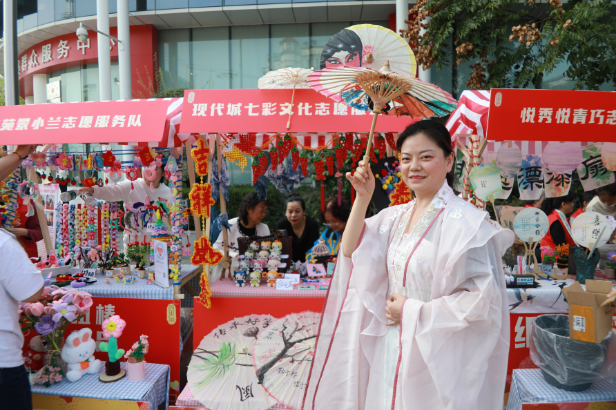 七彩文化志愿服务队撑起一把把油纸伞,每把伞的伞架、伞面均由志愿者手工制作完成。据介绍,牵头制作油纸伞的志愿者潘长鸿是苏恒泰油纸伞的非遗传承人,“制作一把伞,前后需要经过20多道工艺、一个多月制成。这次带到集市售卖,交易金额全部进入社区慈善公益基金的账户,志愿者也积极支持。”