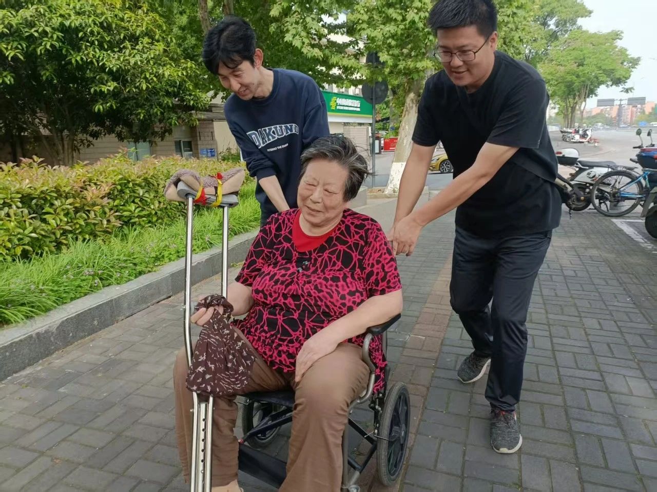 物业公司和社区志愿者一同护送小区行动不便居民回家。