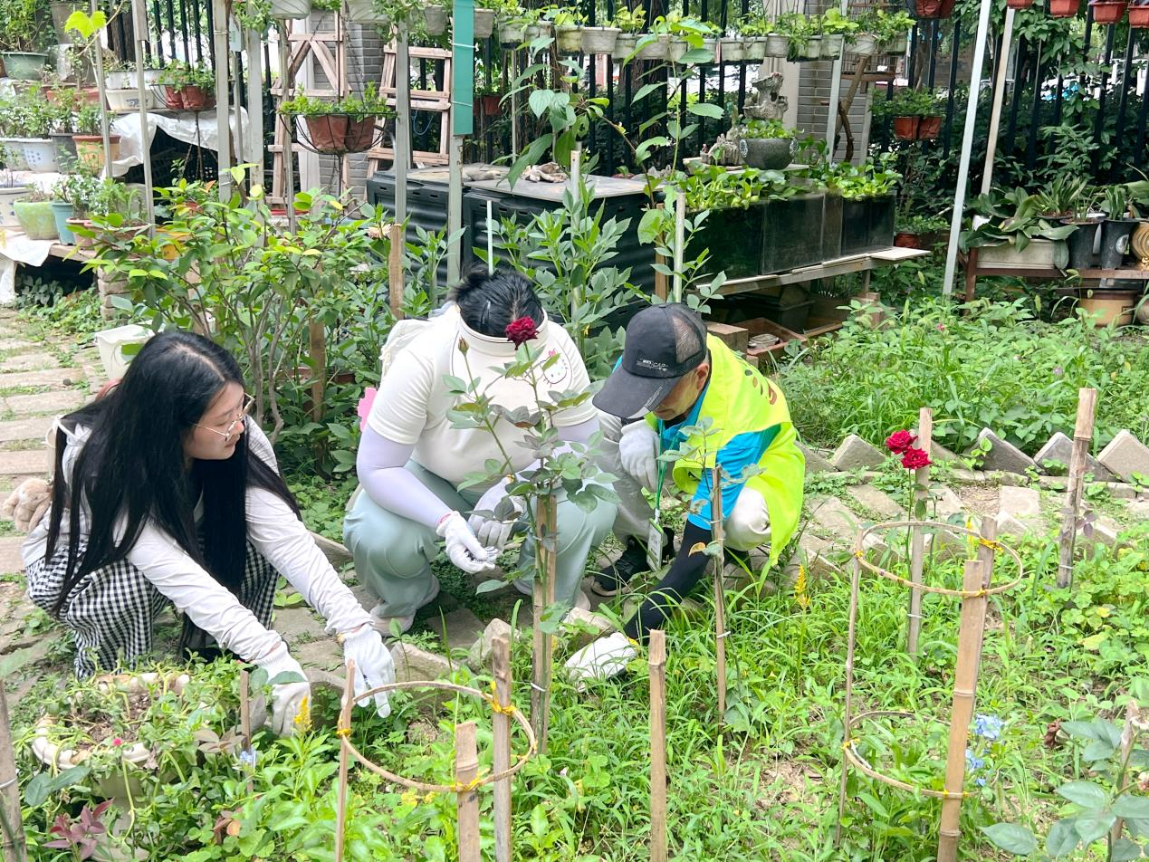 近日,湖北省武汉市江岸区百步亭社区龙庭绿色驿站内弥漫着草木清香,一场园艺师驻点服务活动在此开启。百步亭社区园艺师刘吟山、蔡运福带领社区居民和来社区参与社会实践的江汉大学研究生,共同开展清除杂草服务,为社区绿色驿站的花草“减负”。